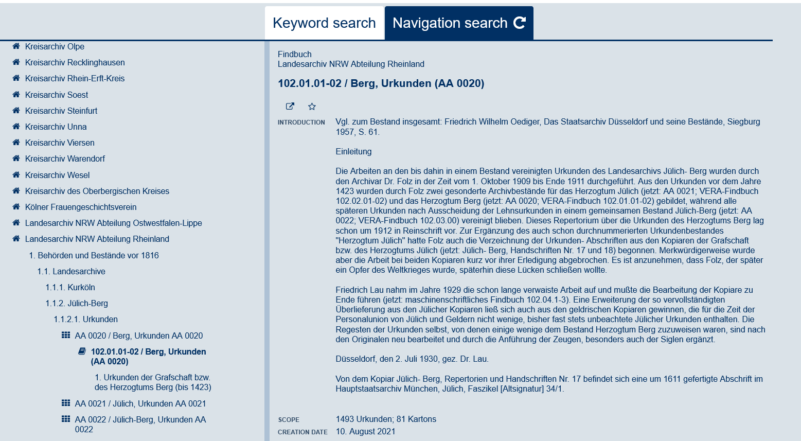 Because navigation search allows users to browse through an archive from top to bottom, from general to specific, it is possible to explore the contents of a collection in a logical manner and thus conduct systematic research independently of keywords and specific search terms.
